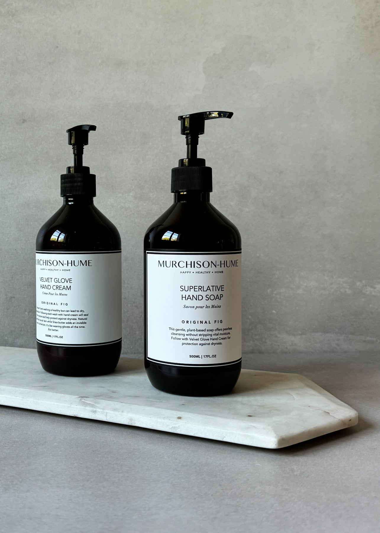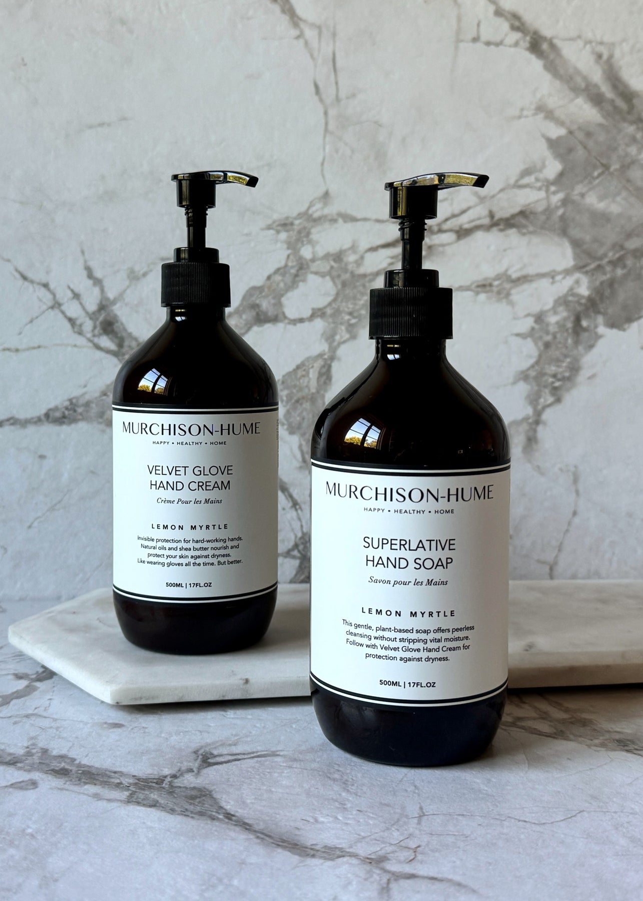 Upgrade your sink with our best-selling beautiful hand soap and double down by getting a matching hand cream. Rinse and lather with the Superlative Hand Soap and follow with Velvet Glove Hand Cream for protection.