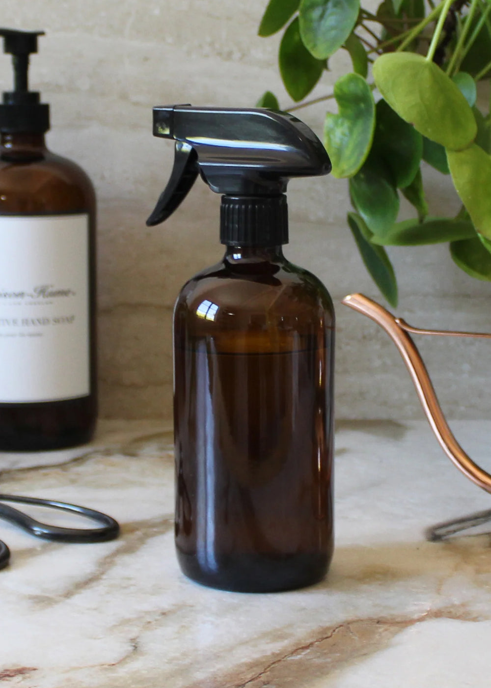 Every Organizer's best styling trick: Decanting your favorite products into glass amber bottles reduces both plastic waste and visual clutter.